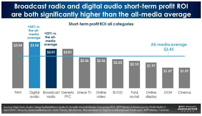 WPP Media’s study shows that both AM/FM radio and digital audio deliver a return on ad spend significantly higher than the average of 11 advertising media, with digital audio ranking third and AM/FM fourth in ROI among those media.